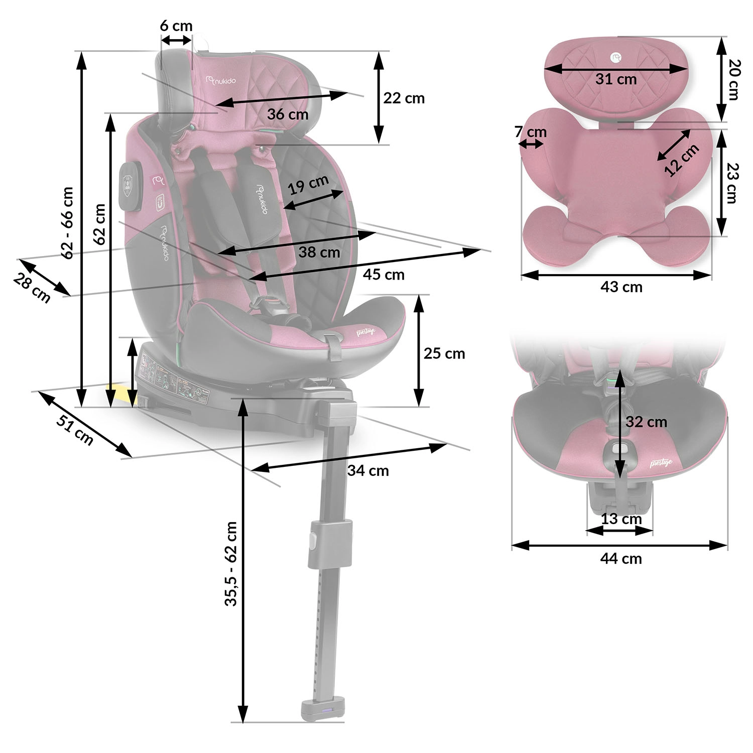 Der Kindersitz Nukido Prestige Line ist für maximale Sicherheit und Komfort von 40 bis 150 cm Körpergröße konzipiert. Das 360°‑Drehsystem ermöglicht es, Ihr Kind seitlich zur Tür einfach anzuschnallen und Rückwärtsfahren (RWF) bis 105 cm oder Vorwärtsfahren (FWF) für größere Kinder zu wählen. ISOFIX und der Stützfuß bieten einen festen Halt, während SIP den Schutz von Kopf, Nacken und Wirbelsäule beim Seitenaufprall erhöht.