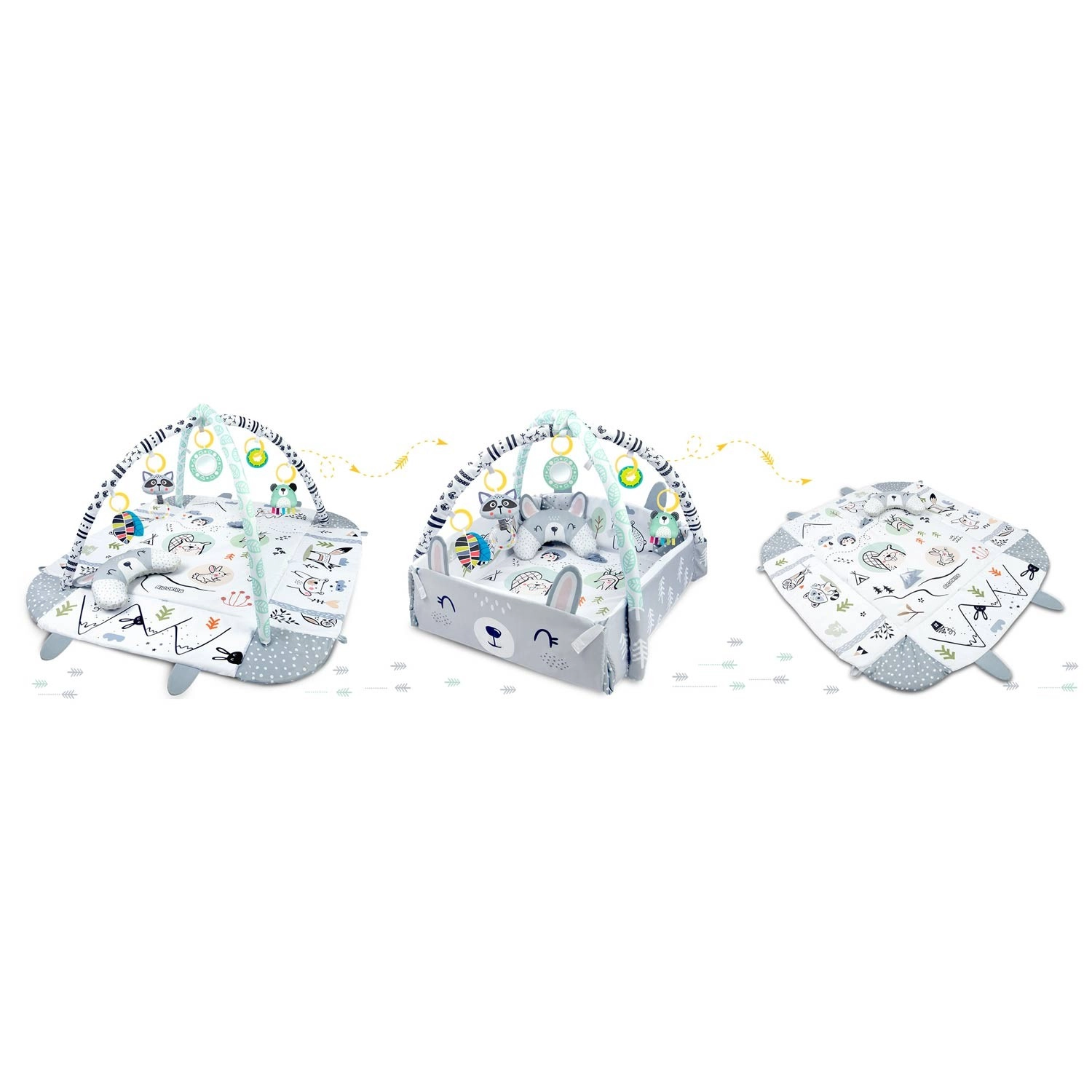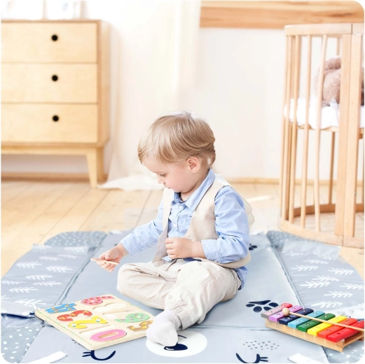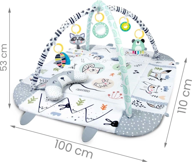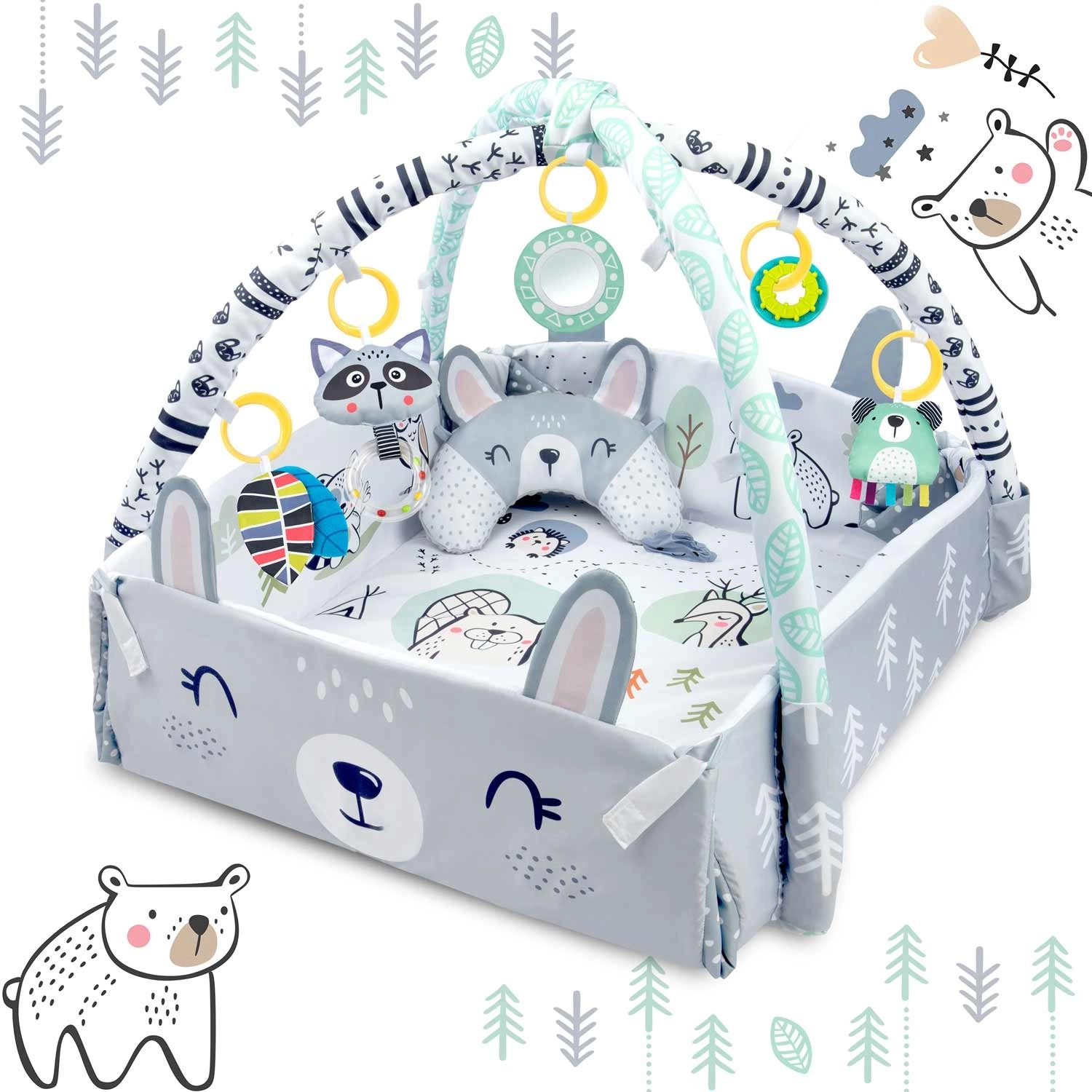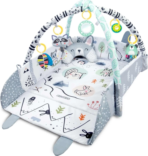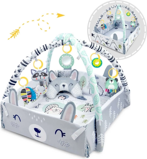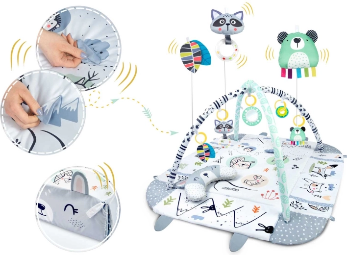 Enthalten sind 7 originelle Spielzeuge, darunter ein Spiegel, Rasseln, Knisterelemente und ein Quietschspielzeug mit sensorischen Bändchen. Spielzeuge und gepolsterte Bögen lassen sich einfach versetzen oder abnehmen. Das Kissen für Tummy Time mit weicher Minky-Seite unterstützt die richtige Positionierung und stärkt Nacken- und Rückenmuskulatur.