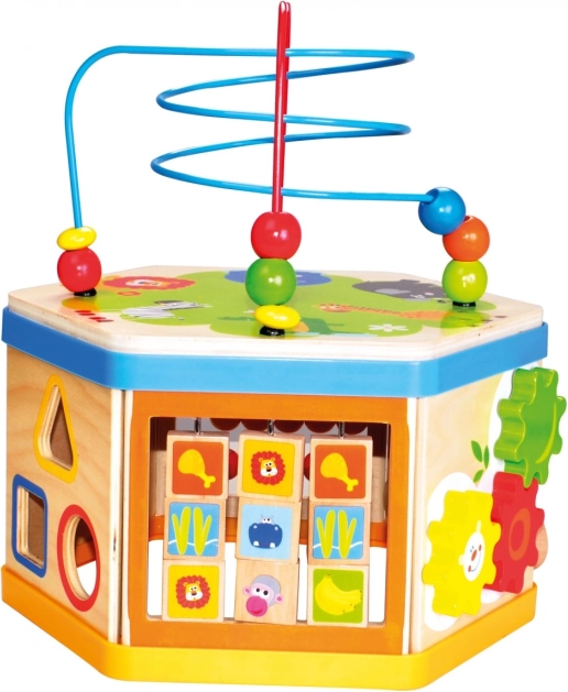 Der vielseitige Motorikspielzeug-Würfel begeistert neugierige Kinder mit bunten Farben und zahlreichen Aktivitäten mit didaktischem Mehrwert. Man kann Perlen im Labyrinth führen, Kugeln zählen, Tier-Ikonen verschieben, sie drehen und ihnen Futter zuordnen, Zahnräder drehen, Klötze einwerfen und das Erkennen der Uhrzeit üben. Das Spielzeug ist robust und aus starkem Sperrholz gefertigt. Hauptmerkmale: Würfel mit Deckel und 3 Teilen zum Einsetzen, fördert die Orientierung in Raum und Zeit, Formen und Farben zuordnen, Feinmotorik trainieren, robuste Ausführung aus Holz.