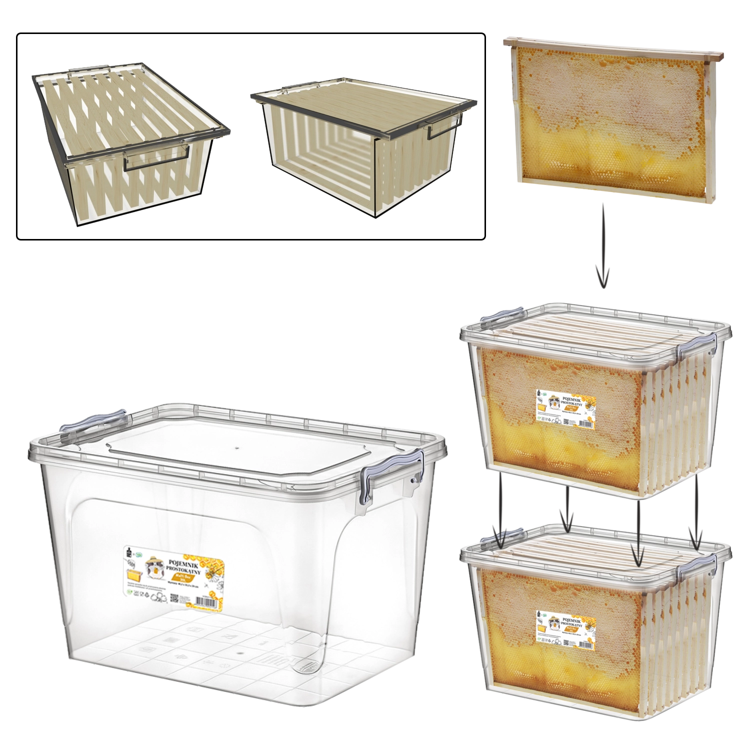 Die rechteckige Multi-Box 30 l ist für den ganzjährigen Einsatz einschließlich der Winterzeit konzipiert. Spezielle Innenleisten halten die Waben so, dass sie nicht an den Wänden anliegen und sauber sowie unbeschädigt bleiben. Ein dicht schließender Deckel verhindert effektiv das Eindringen der Wachsmotte und kleiner Nagetiere, während die transparenten Wände eine schnelle Sichtkontrolle ohne Öffnen ermöglichen.