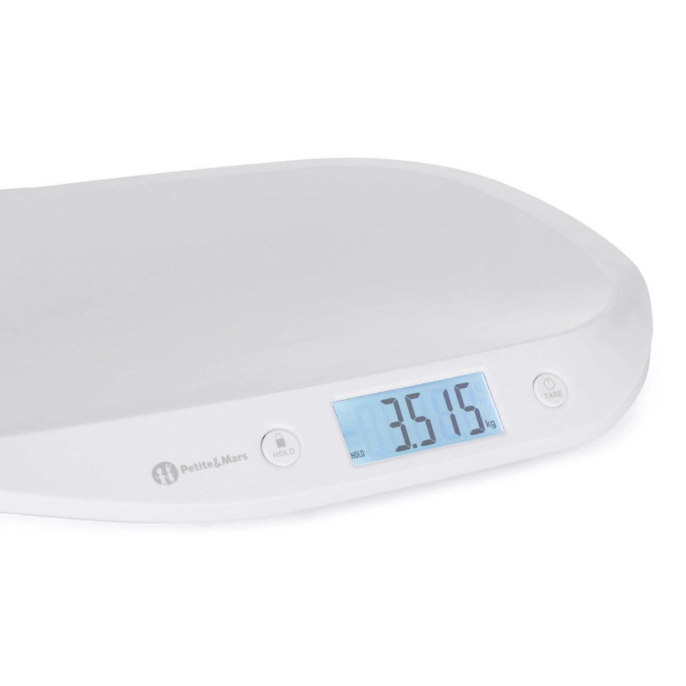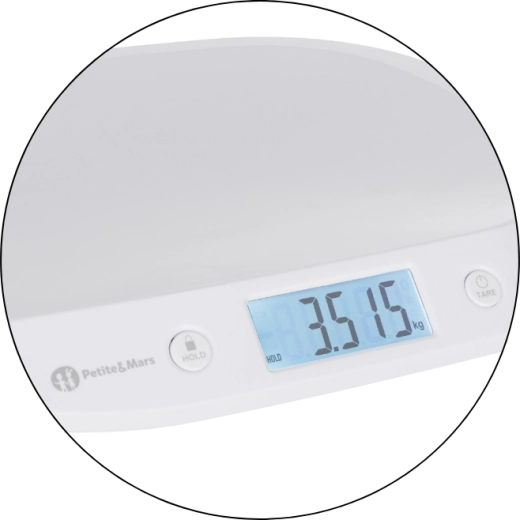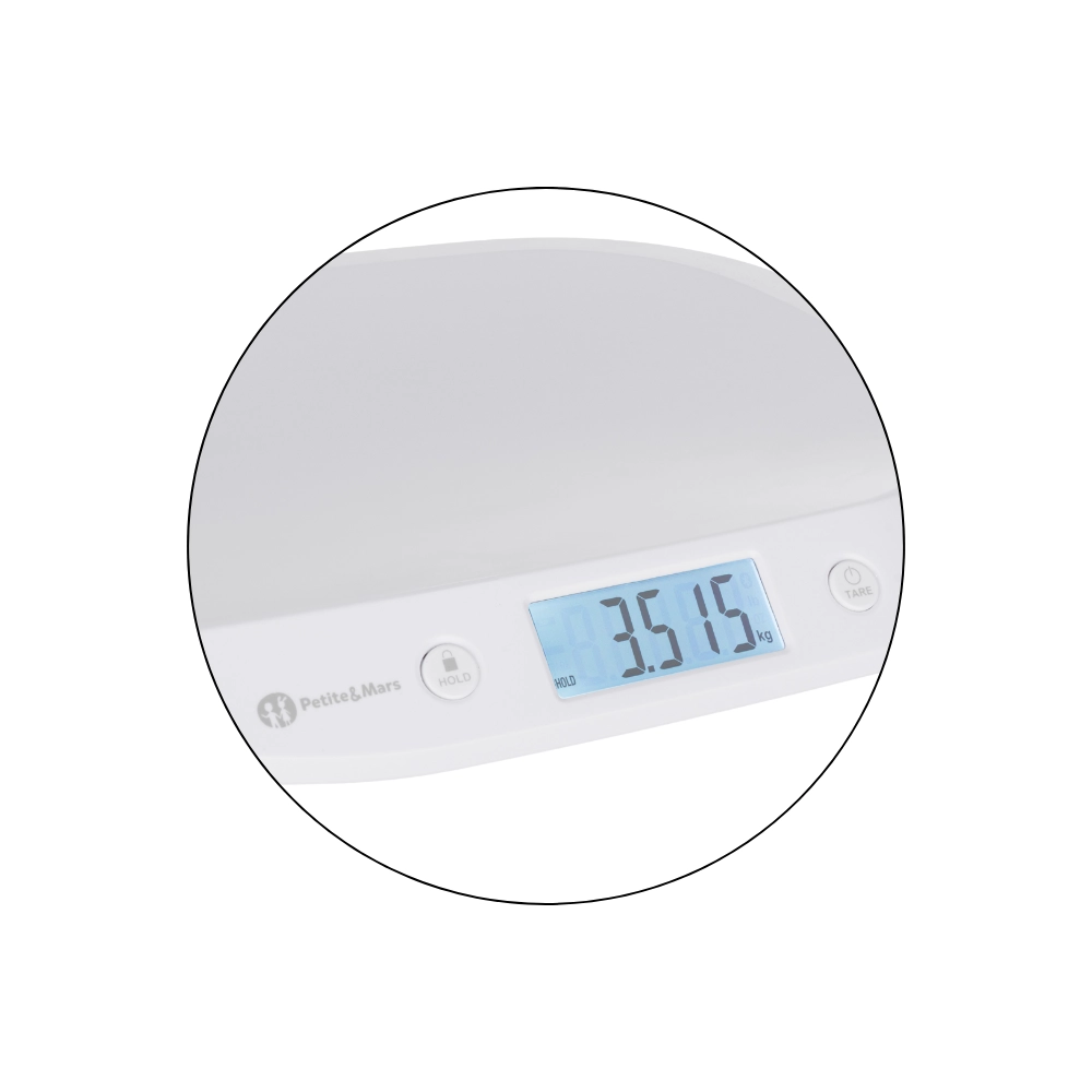 Die Waage PETITE&MARS Balance ist ein praktischer Helfer ab den ersten Lebenstagen Ihres Kindes. Das große, beleuchtete LCD-Display gewährleistet hervorragende Lesbarkeit bei Tag und Nacht, während die HOLD-Funktion (automatisch und manuell) einen stabilen Wert erfasst und anzeigt, auch wenn sich das Baby natürlich bewegt. Dank der TARE-Funktion ziehen Sie das Gewicht von Handtuch oder Decke ganz einfach ab und erhalten ein präzises Ergebnis.
