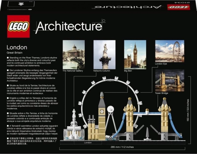 Das Set aus der LEGO Architecture Skyline-Kollektion bildet die berühmtesten Londoner Sehenswürdigkeiten in realistischen Proportionen und Farben nach. Auf dem eleganten Sockel mit der Zierfliese „London“ finden Sie die National Gallery, Nelson’s Column, das London Eye, den Big Ben (Elizabeth Tower) und die Tower Bridge. Transparente Elemente in der Basis stellen den Fluss der Themse dar, sodass das Modell aus jedem Blickwinkel großartig aussieht.