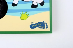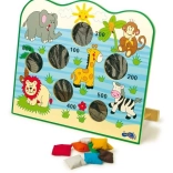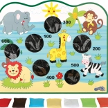 Das Spielbrett mit bunten Tierillustrationen und bunten Beuteln macht das Spiel attraktiv und unterhaltsam für Kinder.