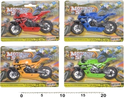 Klein, aber schnell! Dieses 11 cm lange Rennmotorrad begeistert jeden Geschwindigkeitsfan. Dank der Freilauf-Räder fährt es leicht und sanft über den Boden und ist ideal für Kinderrennen und die heimische Sammlung. Erhältlich in 4 fröhlichen Farben – Blau, Grün, Rot und Gelb.