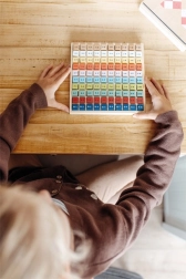 Das Lernen erfolgt spielerisch – Kinder nehmen die einzelnen Teile mit Aufgaben in die Hand, suchen die richtigen Lösungen und setzen sie ins Raster zurück. Dank der übersichtlichen Farbkennzeichnung und dem praktischen Holzrahmen bleibt alles schön geordnet.