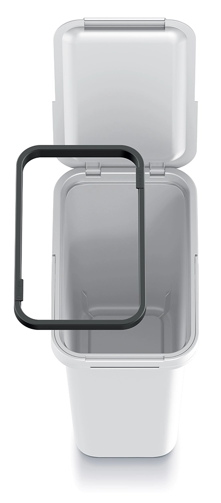 Der Kippdeckel ermöglicht schnelles und hygienisches Einwerfen des Abfalls ohne unerwünschte Gerüche. Der integrierte Innenrahmen hält den Beutel fest, verhindert sein Abrutschen und vereinfacht den Wechsel.