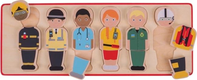 Machen Sie Bildung mit dem Holzpuzzle Einsatzteam unterhaltsam. Dieses farbenfrohe Puzzle bietet sechs Rettungskräfte — Feuerwehrmann, Polizeibeamter, Arzt und weitere, die in die ausgeschnittenen Bereiche auf der Tafel passen.