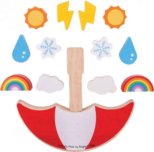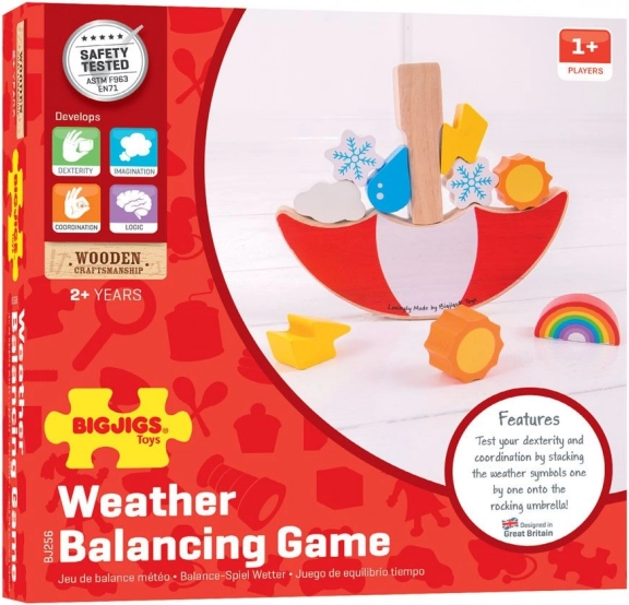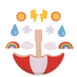 Das Set enthält 13 Teile, darunter ikonische Wettersymbole: Regenbogen, Wolke, Schneeflocke, Tropfen, Sonne und Blitz. Leuchtende Farben unterstützen das Erkennen von Farben und Formen, verantwortungsvoll gewonnenes Holz sorgt für Langlebigkeit und ein angenehmes haptisches Erlebnis. Das Spiel entspricht den europäischen Sicherheitsnormen und ist eine hervorragende Wahl für Kinder ab 2 Jahren.
