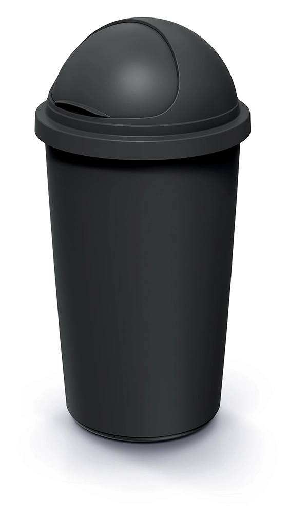 Praktischer Abfalleimer mit 60 l Volumen aus recyceltem schwarzem Kunststoff für Haushalte und kleinere Betriebe. Bietet kompakte Abmessungen, einen in geöffneter Position arretierbaren Deckel für einfaches Entleeren, einen integrierten Griff zur sicheren Befestigung der Beutel und leichte Pflege für eine hygienische Umgebung in Küche, Büro und Bad.