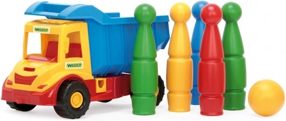 Kippwagen Multi Truck mit beweglicher Ladefläche bietet Spaß für unsere kleinen Kinder. Enthalten ist ein Kegelset mit 5 bunten Kegeln und einer Kugel.