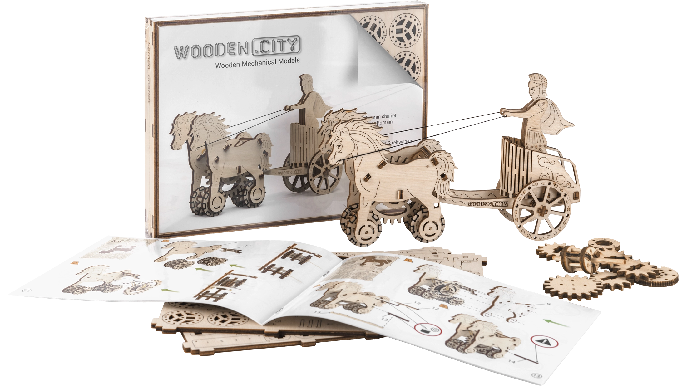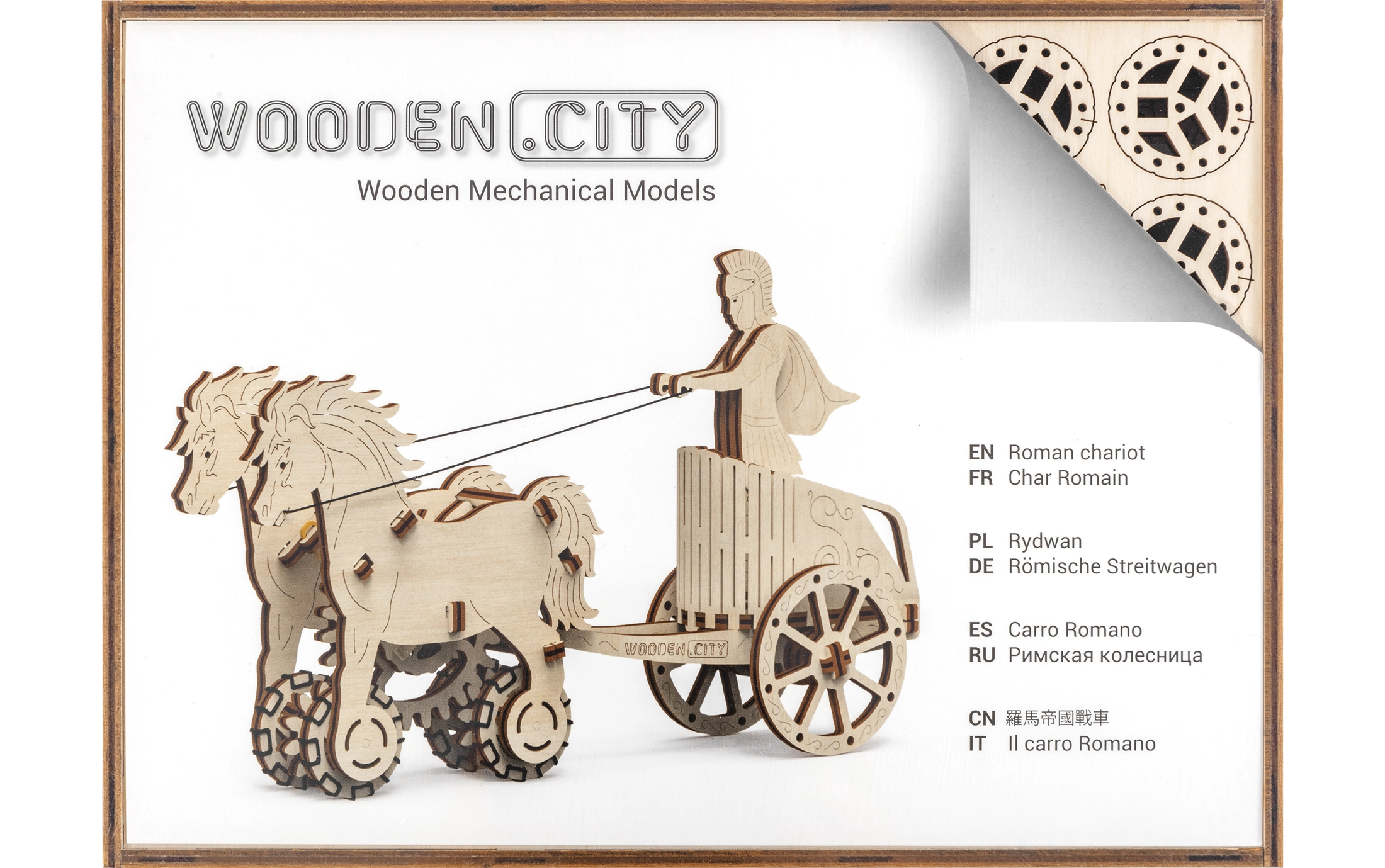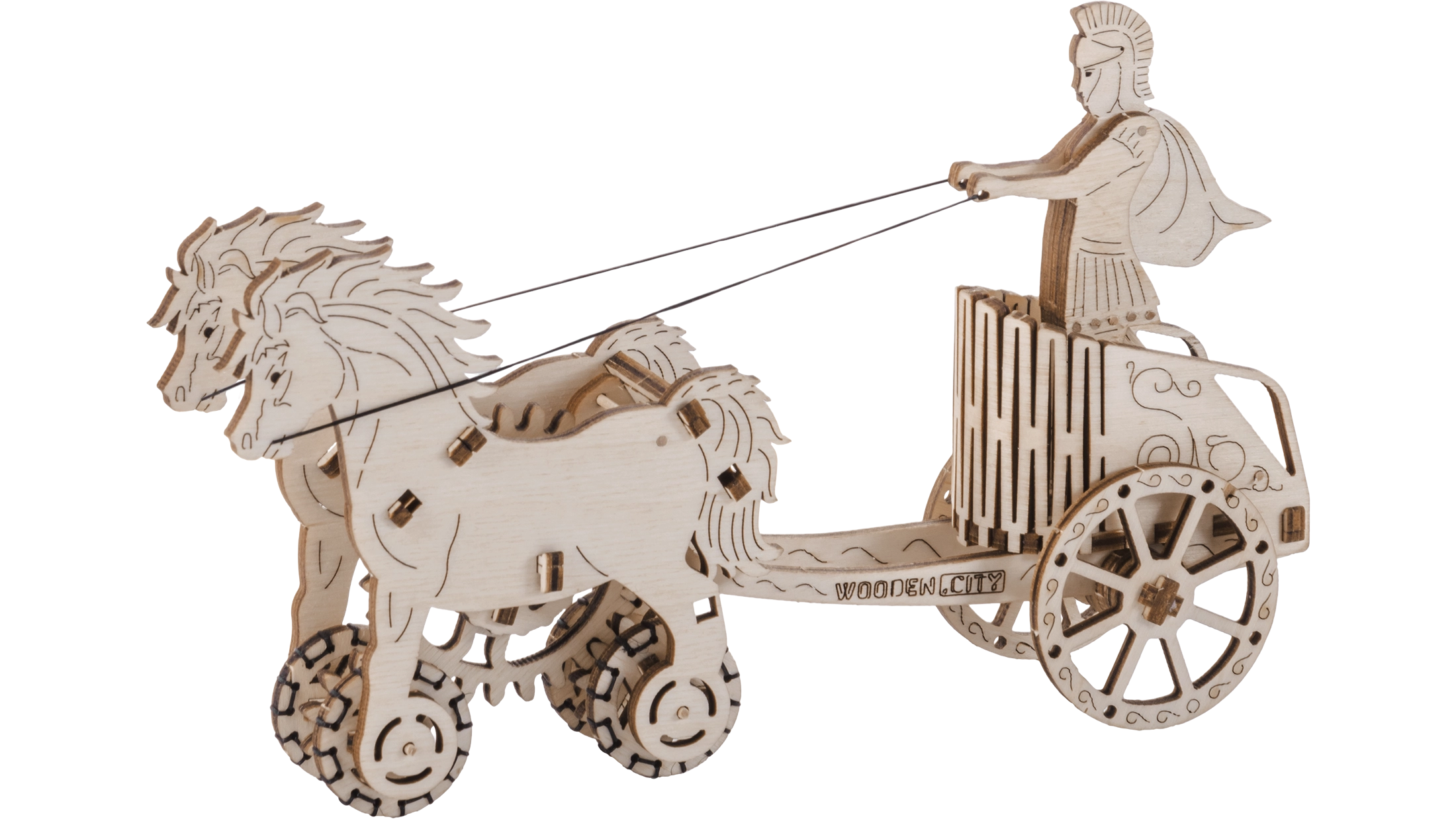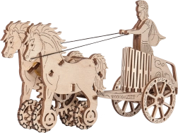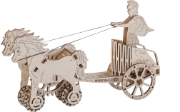 Im Namen des Imperiums. Bausatz eines römischen Wagens mit Doppelgespann, aus Sperrholz gefertigt. Im naturgetreu dargestellten Wagen befindet sich eine detailliert ausgearbeitete Figur eines römischen Reiters. Dank des Aufziehmechanismus kann das Modell fahren; beim Start zeigt es das Aufbäumen des Zug-Doppelgespanns und legt bis zu 1 Meter zurück. Veranstalten Sie Rennen mit weiteren Wooden City Modellen! Ausgestattet mit einer detaillierten Montageanleitung. Hauptmerkmale: 74 präzise ausgeschnittene Teile, niedriger Montagegrad, das fertige Modell kann selbstständig fahren