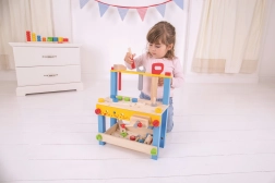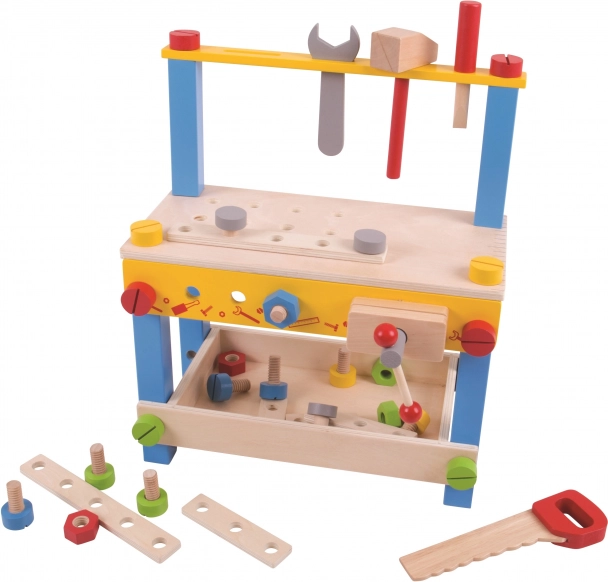 Enthalten sind Schraubstock, Schraubenschlüssel, Schraubendreher, Hammer, Säge, Schrauben und Muttern, die immer wieder zusammengebaut und auseinander genommen werden können. Die stabile Konstruktion und durchdachte Aufbewahrungselemente halten alles übersichtlich griffbereit. Das Set ist ideal für selbstständiges wie gemeinsames Spiel und fördert Geduld und Konzentration.