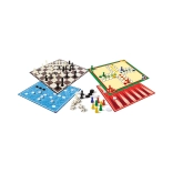 Lieferumfang: 2 beidseitige Spielpläne (4 Spielflächen), 32 Schachfiguren in zwei Farben, 16 Spielfiguren in vier Farben, 30 Damesteine in zwei Farben, 6 Würfel mit Augen, 1 Anleitung.