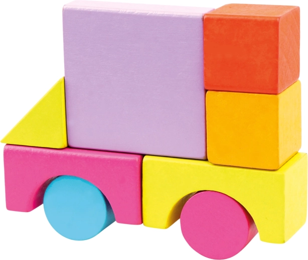 Das Set umfasst Bausteine in verschiedenen Formen – Würfel, Quader, Zylinder, Bögen und Dreiecke – in leuchtenden Farben, die kreatives und offenes Spiel unterstützen.