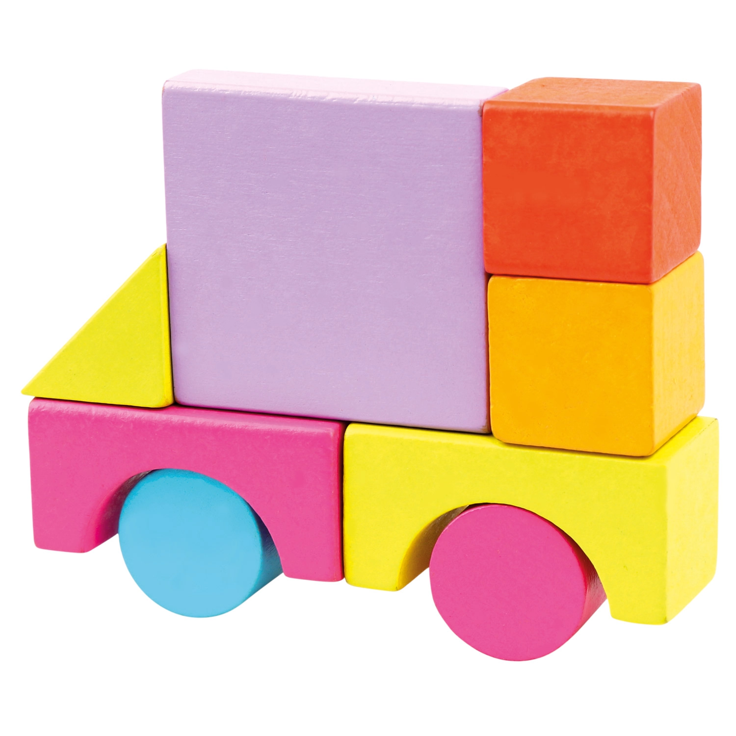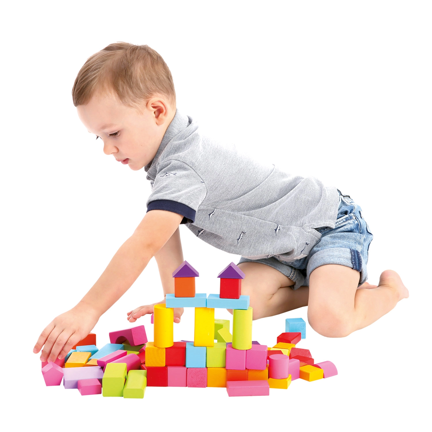 Ideal für Kinder ab 1 Jahr: Die Steine haben eine angenehm glatte Oberfläche, kräftige, unbedenkliche Farben und eine vielfältige Formenpalette – von Würfeln und Quadern über Zylinder bis hin zu Bögen und Dreiecken. Das Spiel mit den Bausteinen unterstützt die Entwicklung von räumlichem Vorstellungsvermögen, Kreativität und Hand-Auge-Koordination.