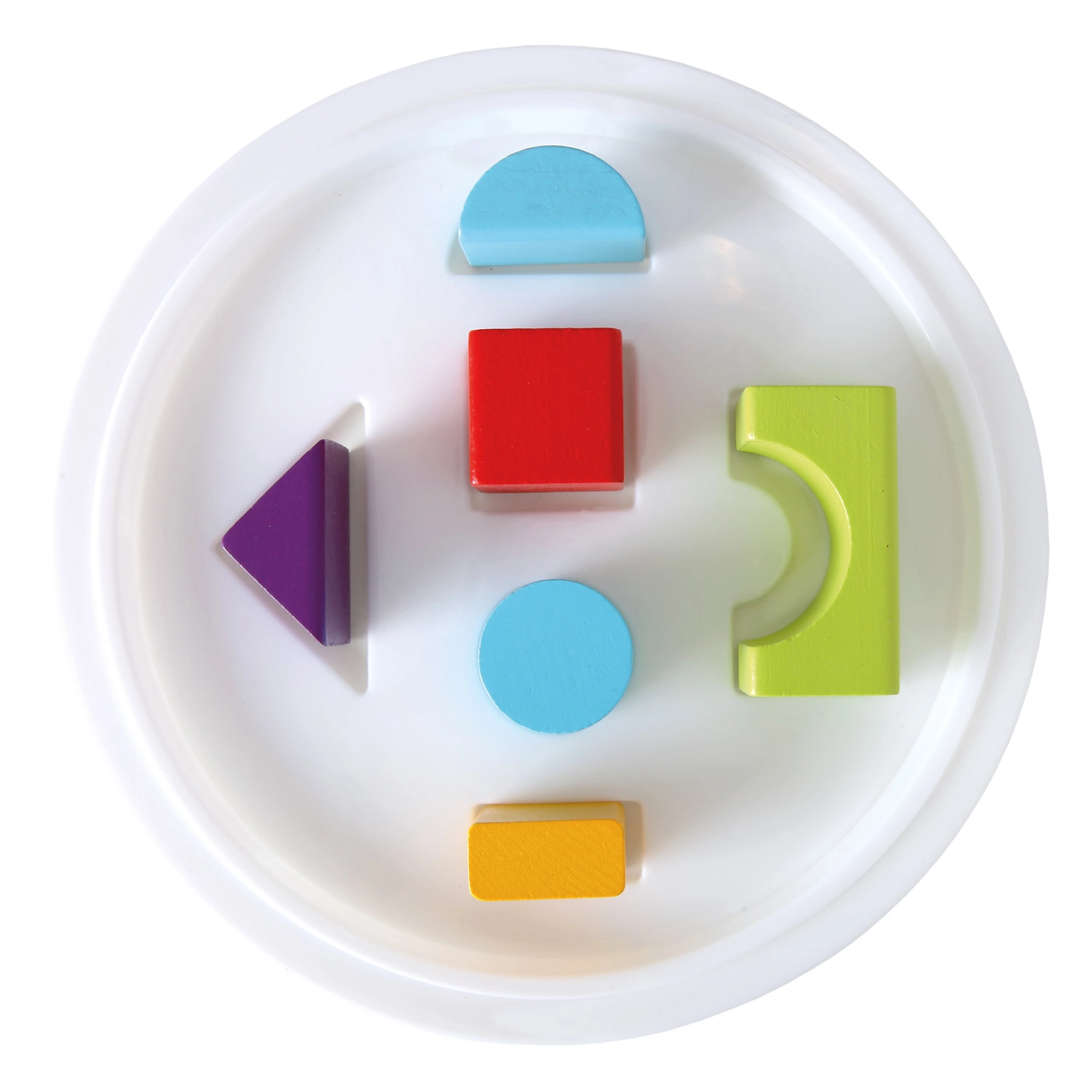 Die Verpackung verwandelt den Eimerdeckel in eine Formensortierhilfe. So trainieren Kinder ganz nebenbei Formerkennung, Koordination und logisches Denken beim Aufräumen der Steine.