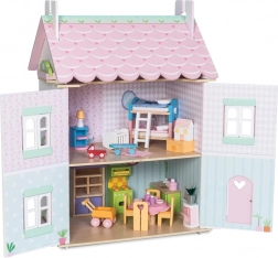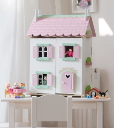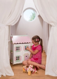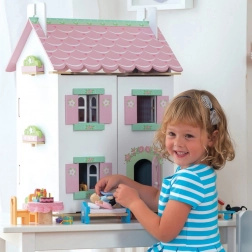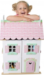 Das Puppenhaus Sweetheart Cottage bezaubert mit Details – Herzchen- und Blumenmotive, Pastelltöne und ein durchdachtes Raumkonzept. Die Vorderseite lässt sich komplett öffnen, sodass Kinder bequemen Zugang zu allen Räumen haben, und durch Anheben eines Dachteils entdecken sie einen gemütlichen Dachboden.