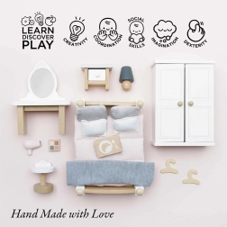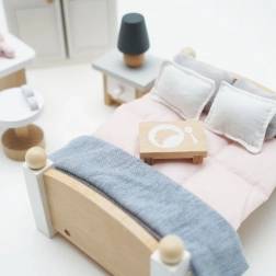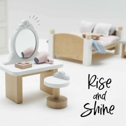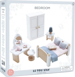 Le Toy Van präsentiert ein Schlafzimmer-Set, das Eleganz und Komfort in jedes Puppenhaus bringt. Die verspielte, träumerische Welt der kindlichen Fantasie wird mit diesem Set zur Realität.