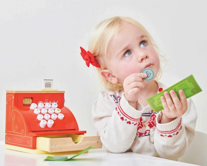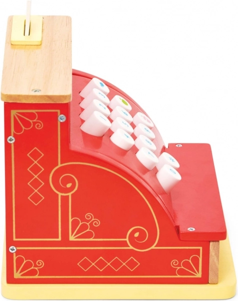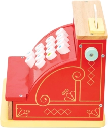 Die fröhliche rote Farbe mit goldenen Akzenten und die großen Tasten machen die Kasse zu einem attraktiven Stück für jeden Kinderladen.