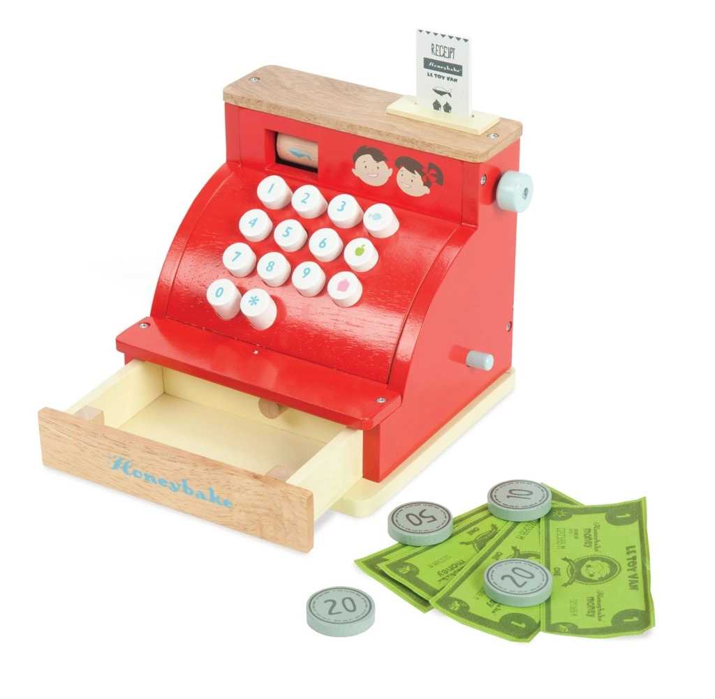 Die rote Holzkasse von LE TOY VAN aus der preisgekrönten Honeybake-Kollektion vereint hochwertige Verarbeitung, sichere Materialien und einen bezaubernden Vintage-Look mit goldenen Details. Ideal für Kaufladen-Spiele sowie zur Förderung sozialer Fähigkeiten, Kreativität und grundlegender mathematischer Kompetenzen.