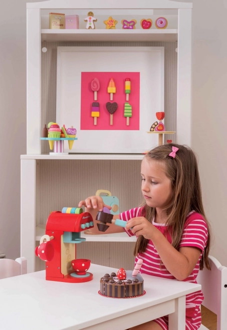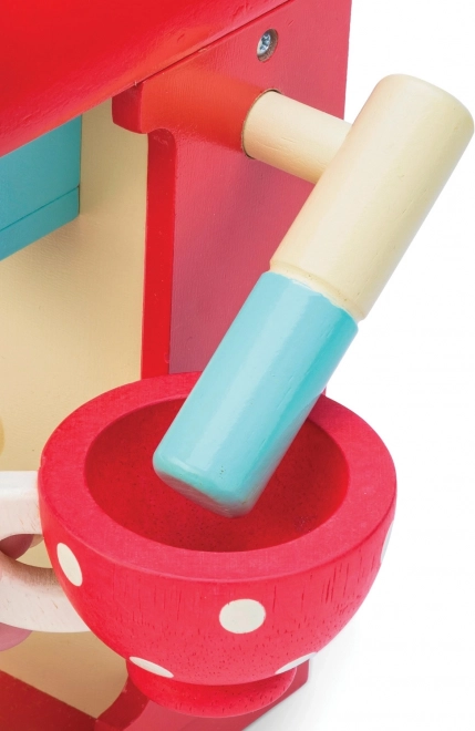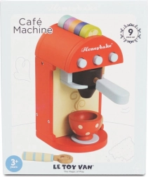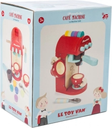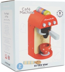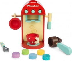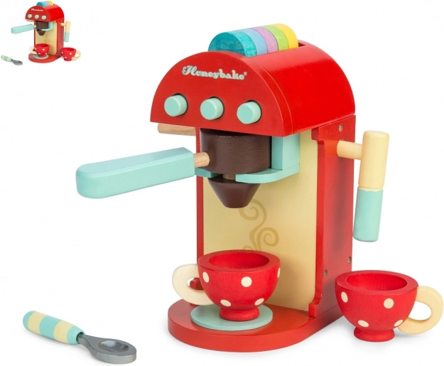 Diese hochwertige Holz-Kaffeemaschine vermittelt Kindern ein authentisches Erlebnis der Kaffeezubereitung. Bunte Kapseln können in den Siebträger eingesetzt und das Getränk direkt in die bemalte Tasse „gekocht“ werden, ein Milchaufschäumer und ein Löffel sind ebenfalls dabei. Die Kapseln lassen sich praktisch in der Öffnung an der Oberseite des Geräts verstauen – so ist alles griffbereit.