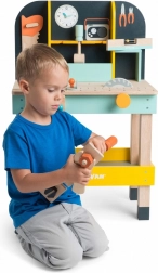 Die Werkbank besteht aus hochwertigem FSC-Holz und ist mit ungiftigen Farben auf Wasserbasis bemalt. Die langlebige Konstruktion hält dem täglichen Spiel stand.