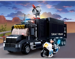 Das Herzstück des Sets ist ein schwarzer SWAT-Lkw – eine mobile Einsatzzentrale mit realistischen Details, die als Zentrale für alle Polizeieinsätze dient. Ideal für taktische Verlegungen und die Einsatzplanung.