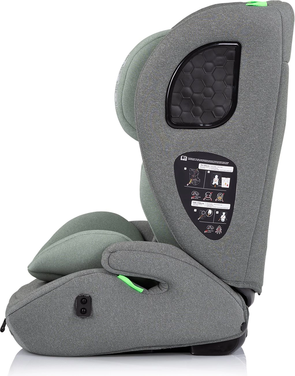 Der Sitz erfüllt die neueste i-Size-Norm einschließlich Tests für Front-, Heck- und Seitenaufprall. Die Auswahl nach Körpergröße gewährleistet die richtige Positionierung des Kindes.