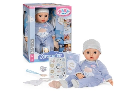 Die interaktive Puppe BABY born Alexander bringt Kindern ab 3 Jahren jede Menge Spaß und zarte Momente. Beim Füttern mit dem Fläschchen oder mit dem Schnuller bewegt sie Mund und Augen, nach dem Essen stößt sie auf, wenn man sanft auf den Rücken klopft, und bei Müdigkeit wiegen Sie sie in zwei Richtungen in den Schlaf. Dank fröhlicher Kinderturn-Übungen macht sie heitere Kindergeräusche und lacht, wenn man sie am Bäuchlein kitzelt. Für ein noch authentischeres Erlebnis entwischt ihr gelegentlich auch ein kleiner Kinderfurz.