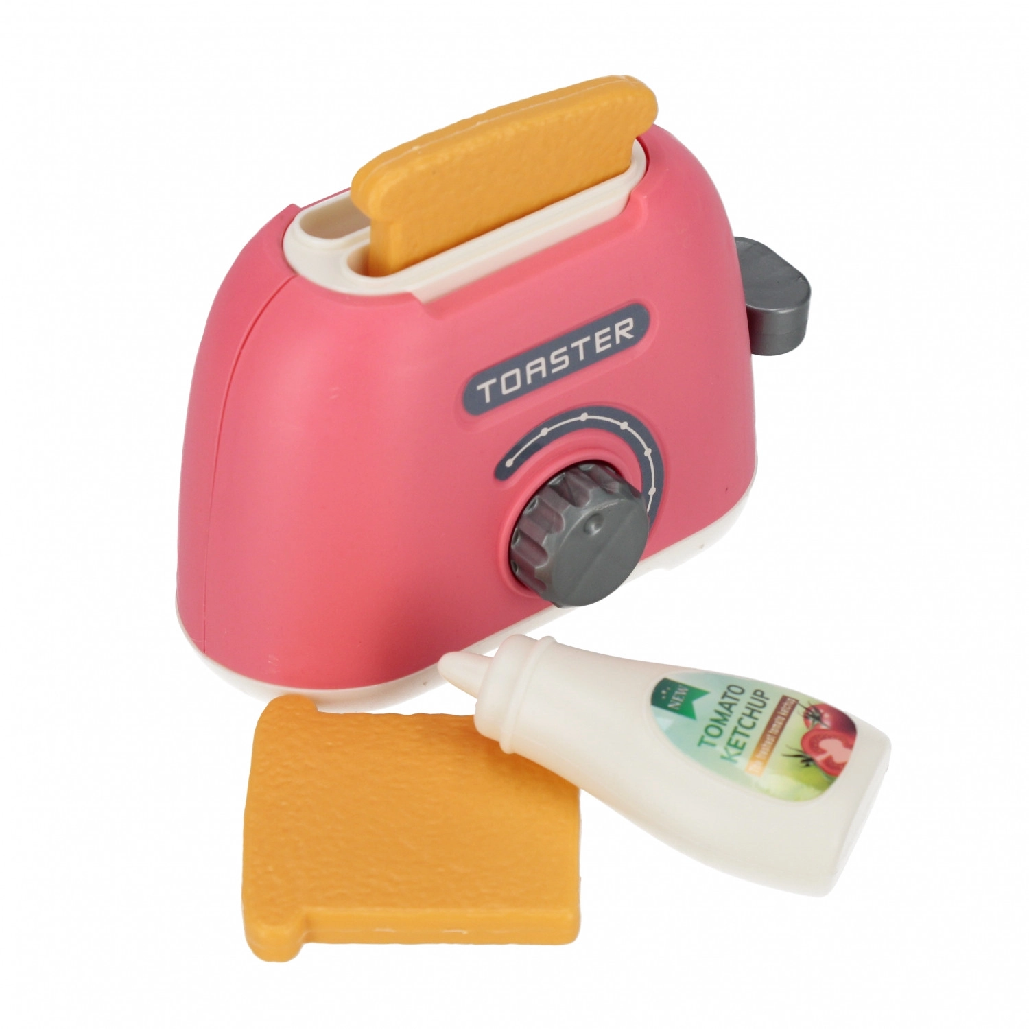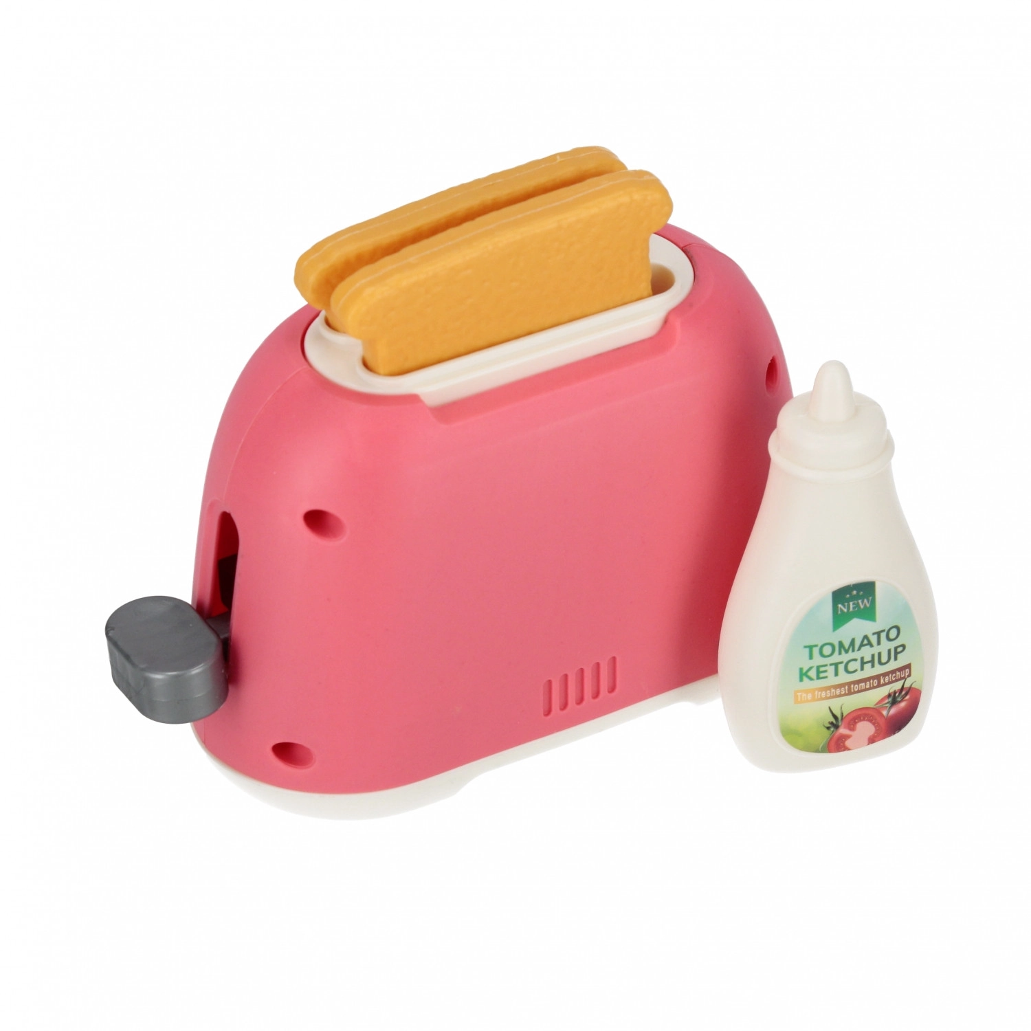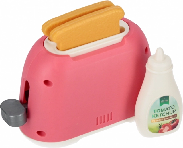 Kleiner rosa Toaster mit Hebel und Drehskala zur Einstellung des „Röstgrads“ – perfekt fürs Küchen-Rollenspiel. Enthalten sind 2 Toasts und eine Ketchupflasche.