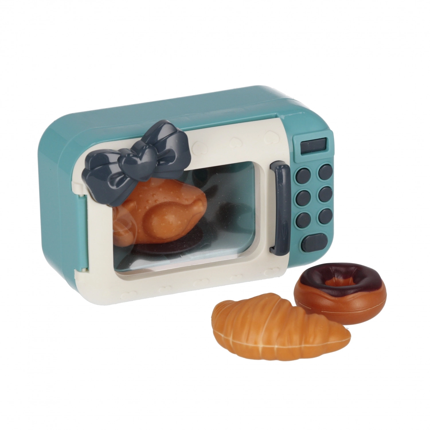 Niedliche Mikrowelle mit transparenter Tür und Tasten. Kinder können „Hähnchen“, Croissant und ein süßes Dessert „erwärmen“.