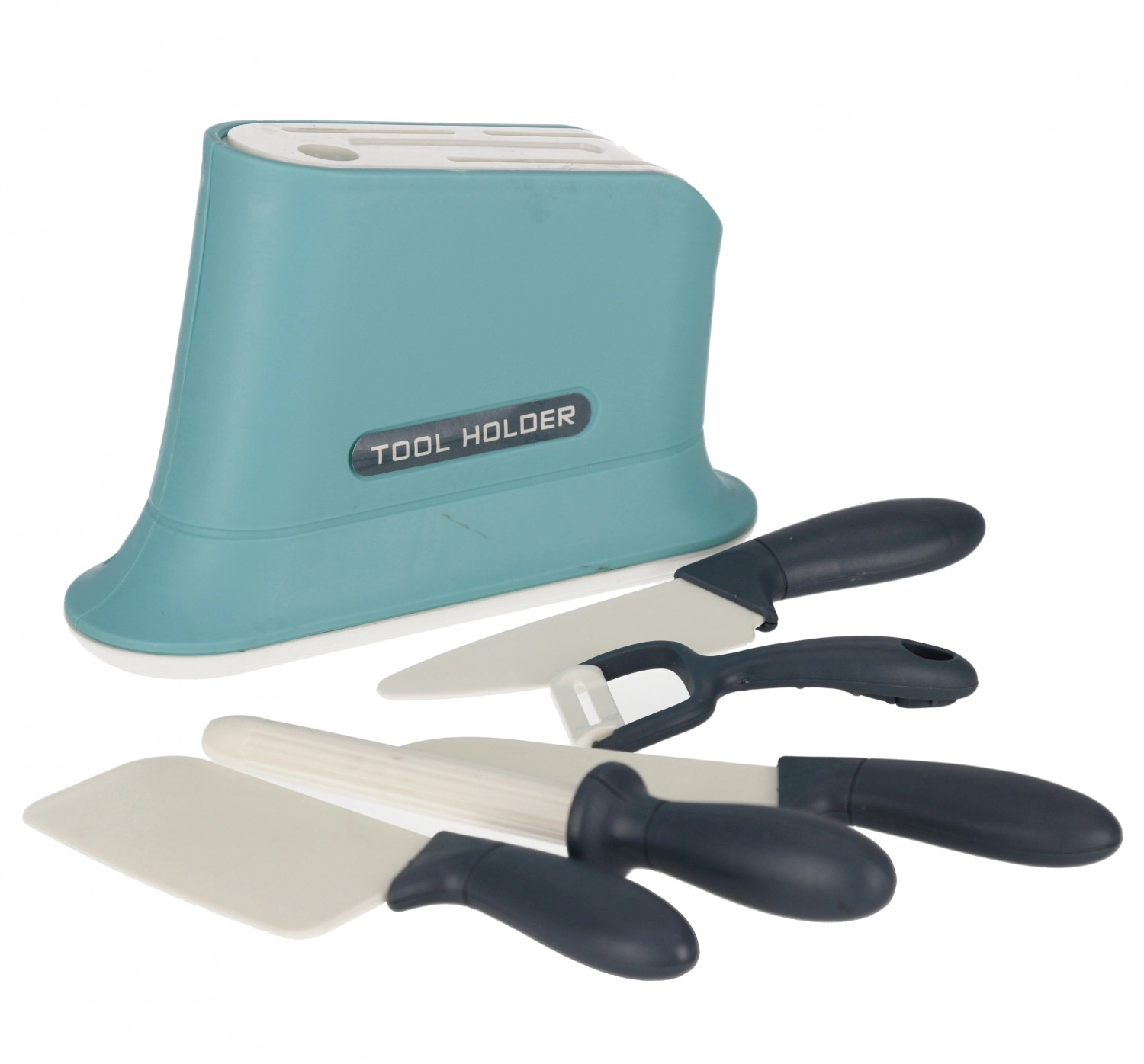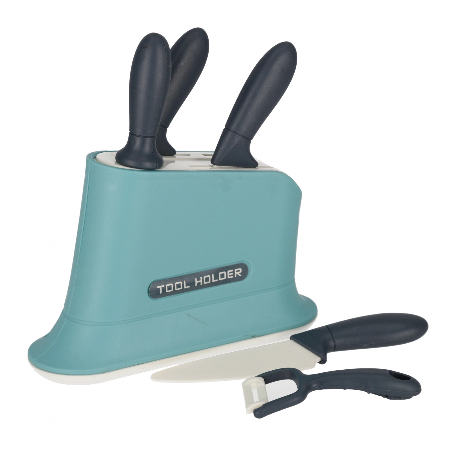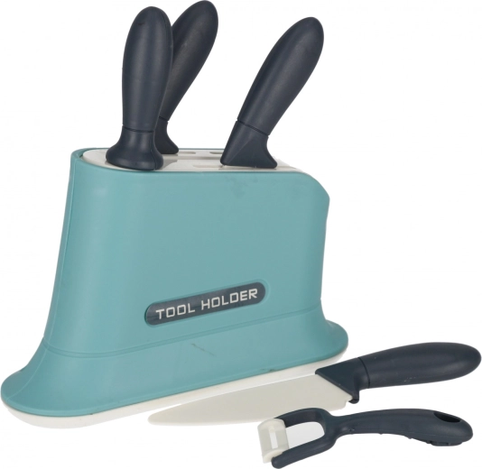 Sicheres Übungsset für kleine Köche: Werkzeugständer, mehrere Messer und ein Schäler mit ergonomischen Griffen für bequemes Halten.