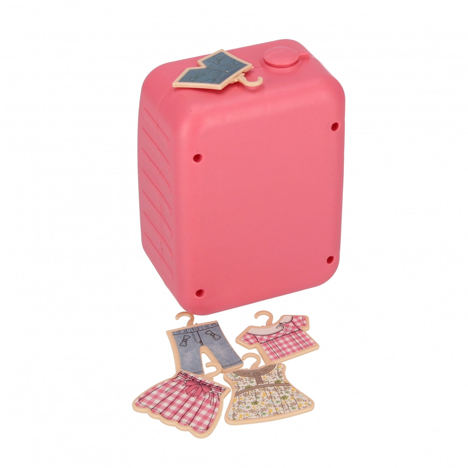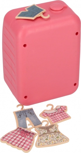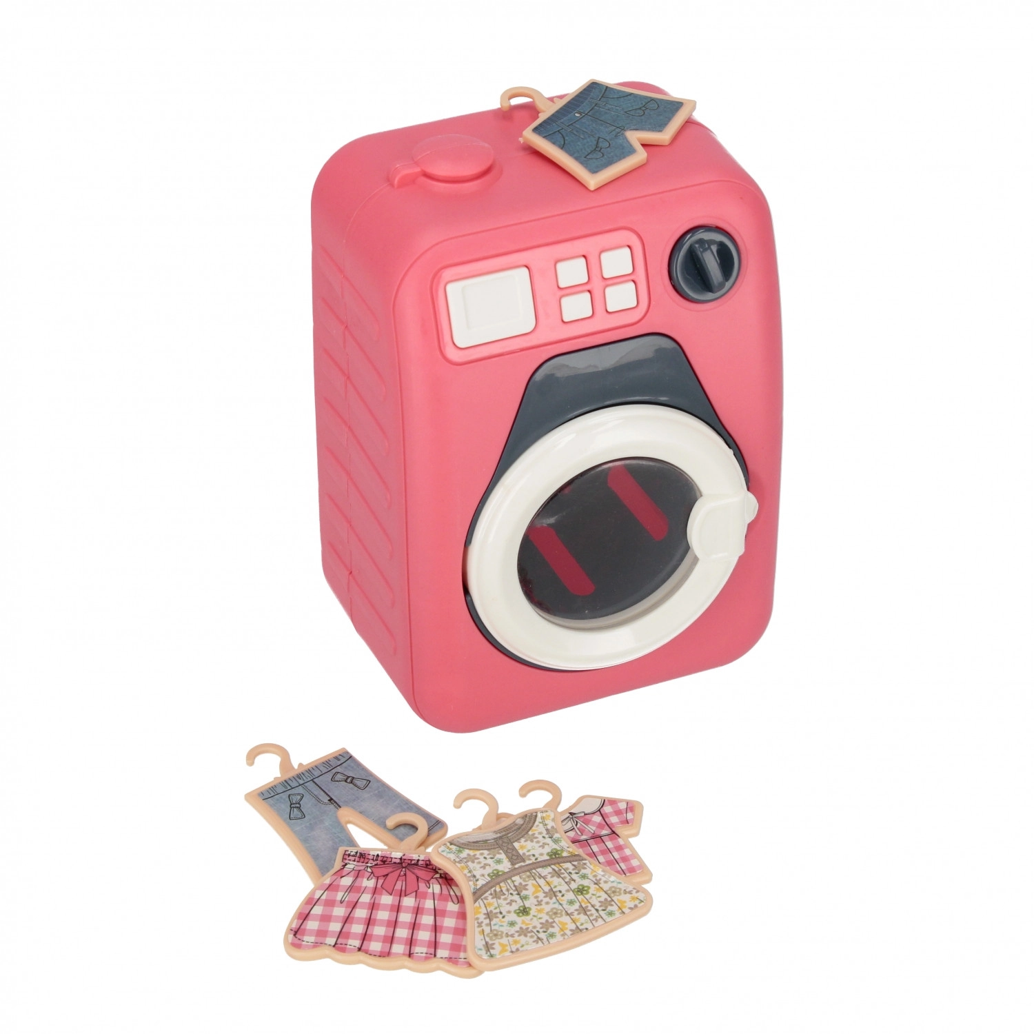 Rosa Frontlader-„Waschmaschine“ mit transparenter Tür und Bedienfeld. Inklusive 5× Kleiderbügel mit Kleidung – Kinder können Wäsche „waschen“, aufhängen und sortieren.