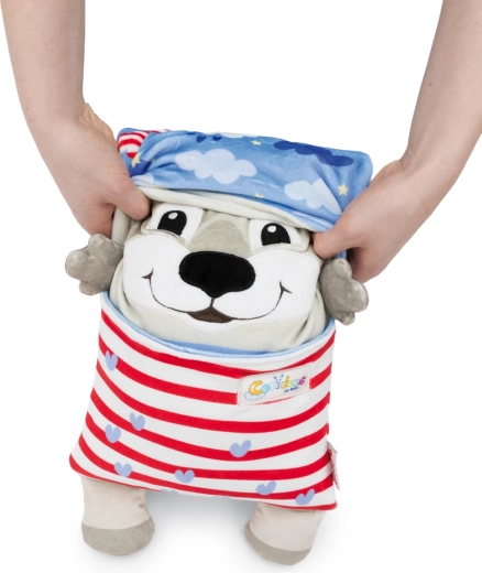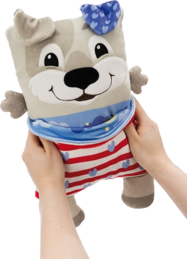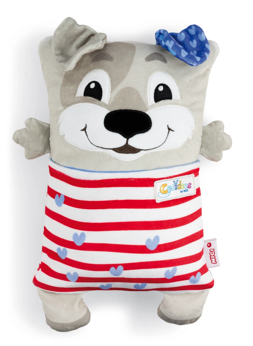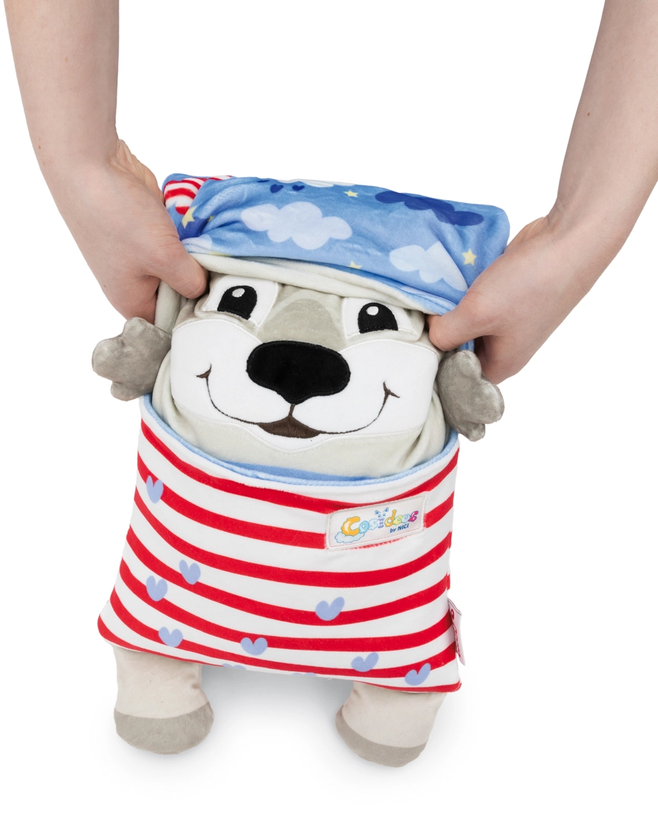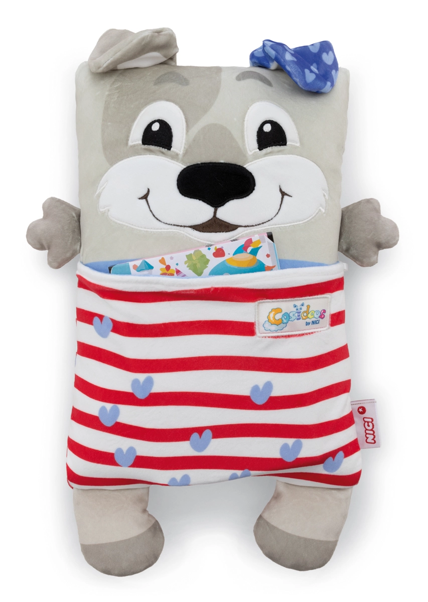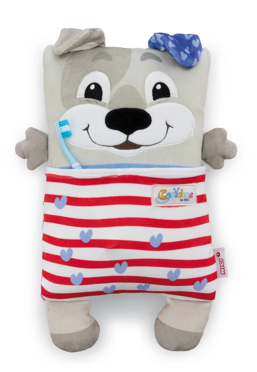 Der niedliche NICI Cosidoos Hund ist ein zweiseitiges Plüschtier und Kissen, das sich mit einer Bewegung vom fröhlichen Tagesbegleiter zum beruhigenden Nachtkissen verwandeln lässt. Superweicher Plüsch, clevere Taschen für Kleinigkeiten und ein Design mit Tag- und Nachtmotiven unterstützen entspanntes Einschlafen und kreatives Spielen. Ideal für Kinder ab 12 Monaten.