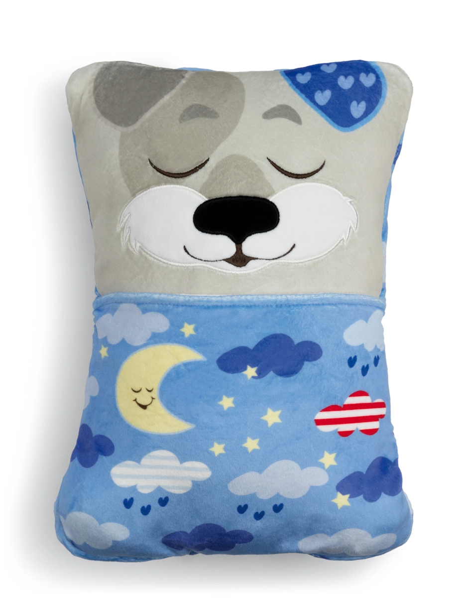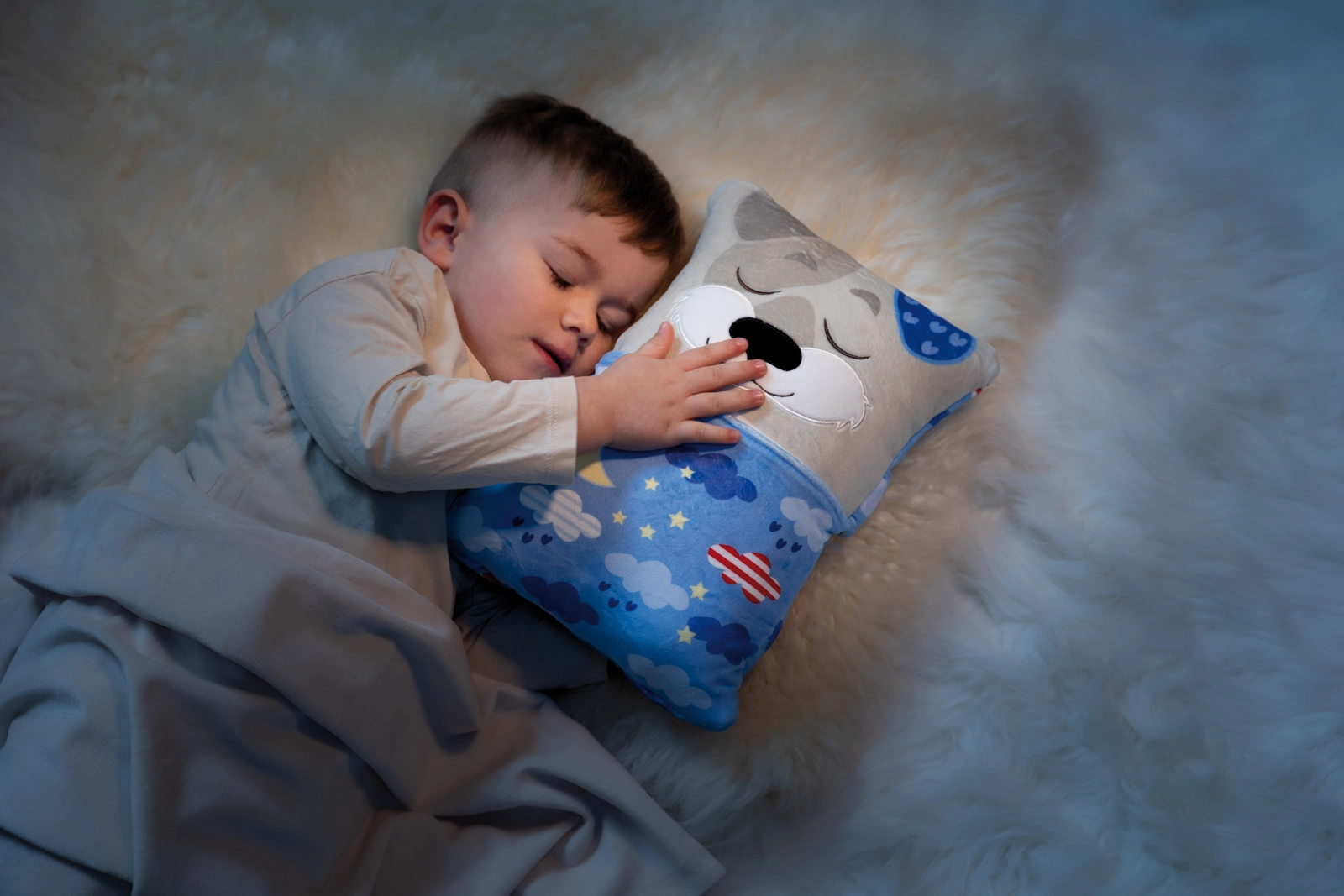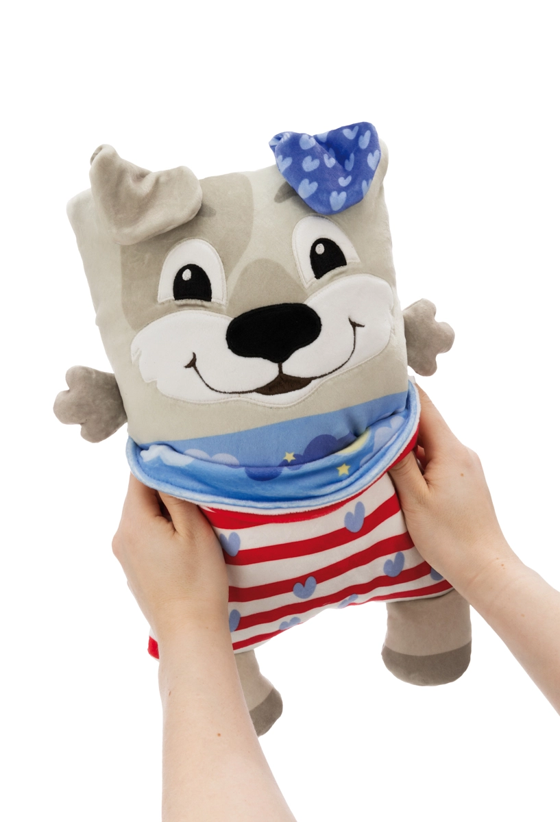 Mit einem einfachen Umdrehen verwandelt sich der fröhliche Hund in ein beruhigendes Nachtkissen mit Wolken, Sternen und Mondsichel. Das perfekte Ritual für leichteres Einschlafen.