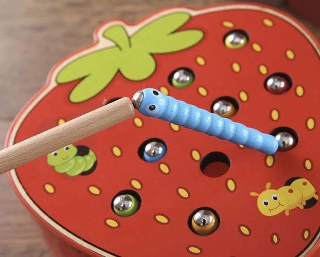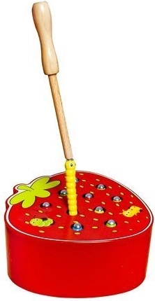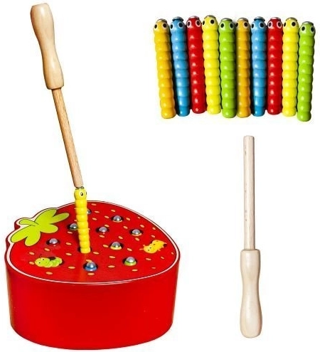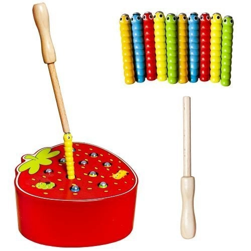 Fang das Würmchen! Dieses niedliche Holzspiel in Erdbeerform beschäftigt Kinder lange Zeit. Mit dem Magnetstäbchen ziehen sie die Würmchen aus den Öffnungen und stecken sie wieder zurück – so trainieren sie Feinmotorik, Genauigkeit und Konzentration. Die natürlichen Eigenschaften des Holzes werden durch eine robuste Verarbeitung und sichere, glatte Kanten ergänzt.