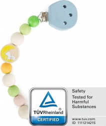 Hergestellt aus hochwertigem Holz mit glatter Oberfläche und sicheren, schadstofffreien Farben. Speichelfestigkeit und robuste Verarbeitung sorgen für eine lange Lebensdauer. Die universelle Schlaufe passt an die meisten Schnuller mit Ring.