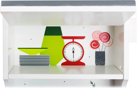 Die drehbaren Knöpfe mit Klickgeräuschen und der Backofen mit magnetischer Schließung verstärken das realistische Spielerlebnis und dienen gleichzeitig als praktischer Stauraum. Die Küche enthält weitere Regale und Haken zum Aufbewahren von Spiel-Lebensmitteln und Geschirr.