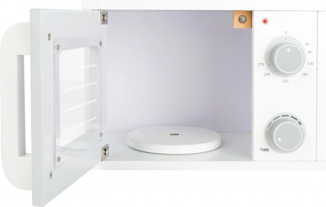 Die Holzmikrowelle für Kinder von Small Foot bietet realistische Details, wie drehbare Knöpfe zur Einstellung von Temperatur und Zeit sowie ein magnetisches Türschloss, das die kindliche Fantasie beim Spielen anregt.