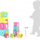 Fröhliche Tierillustrationen und kräftige Farben motivieren Kinder zum Spiel, das gleichzeitig lehrt. Jeder Würfel ist mit einer Zahl versehen, sodass Kinder spielend von 1 bis 10 zählen, Größen vergleichen und das räumliche Vorstellungsvermögen beim Turmbau und Ineinanderstecken trainieren.