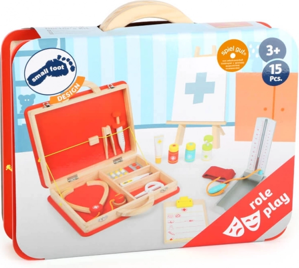 Dieses hochwertige hölzerne Rettungsset im Koffer ist ideal für Arztspiele. Dank der umfangreichen Ausstattung und funktionalen Elemente, wie Pumpfunktionen an Spritzen und Spendern, können Kinder realistisch Puppen und Plüschtiere „behandeln“, den Blutdruck messen und alles in der eigenen medizinischen Dokumentation notieren.