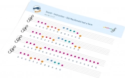 Die beiliegenden farbcodierten Notenblätter (z. B. „Old MacDonald“) helfen Kindern, Farben den Tönen zuzuordnen und schnell die ersten Melodien zu erlernen.