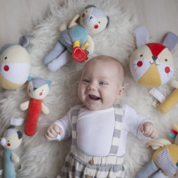 Kontrastreiche Muster, vielfältige Texturen und feine Details fördern die Entwicklung von Sehen, Tasten und Feinmotorik ab 0+.