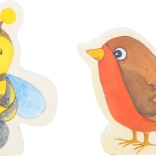 Zwei Holzfiguren begleiten das Kind beim Lesen und Spielen und können mithilfe von Klettverschlüssen auf der Rückseite des Buches befestigt werden.