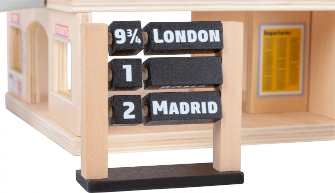 Verwandeln Sie das Kinderzimmer in einen lebhaften Bahnhof! Diese Holzeisenbahn mit zweistöckigem Bahnhof aus 100% FSC-Holz bietet 31 Teile, darunter Zug, Laden, Fahrkartenautomat, Tafel mit Reisezielen und Uhr. Dank des offenen Dachs ist das Spielen einfach und übersichtlich, und das tiefere Schienenprofil ermöglicht die Fahrt auch mit batteriebetriebenen Zügen (nicht enthalten).