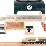 Inbegriffen sind ein Zug und eine vollständige Strecke mit tiefem Schienenprofil, auf denen auch gängige batteriebetriebene Züge fahren können. Mit klarer Beschilderung der Bahnsteige, Uhr und Wegweisern wirkt der Bahnhof „wie in echt“ und fördert Orientierung, Planung und soziale Interaktion.