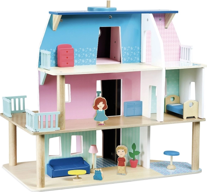 Das Puppenhaus besticht durch sein farbenfrohes Erscheinungsbild mit pinker Fassade und blauem Dach. Es bietet mehrere Etagen, Balkone und ist mit Möbeln und Dekorationen ausgestattet.