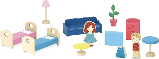 Das Set enthält eine Sammlung von Holzmöbeln und Figuren, einschließlich Bett, Sofa und kleinen Tierfiguren. Kinder können so Miniatur-Hausszenen gestalten.