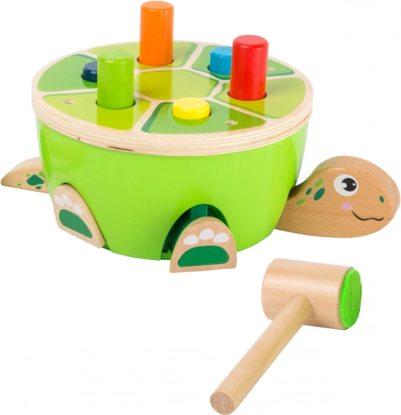 Die kleine Schildkröte mit bunten Steckstiften zieht Kinder in ein cleveres mechanisches Spiel: Wird ein Stift hineingeklopft, fährt automatisch ein anderer heraus. Bei jedem Schlag strecken sich zudem Beine, Kopf und Schwanz der Schildkröte – jeder Klopfer wird so mit einem lustigen Effekt und unmittelbarem Feedback belohnt.