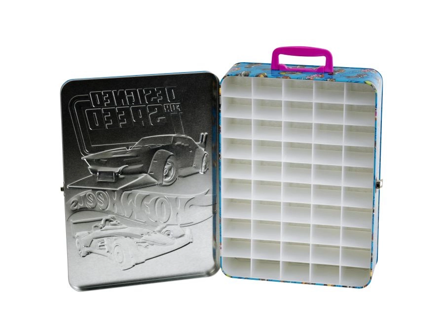 Ein robustes Metallgehäuse mit farbigem Aufdruck und HOT WHEELS-Logo, ein bequemer orangefarbener Griff und ein zuverlässiger Metallclip gegen unbeabsichtigtes Öffnen machen diesen Koffer zur idealen Aufbewahrungslösung für zu Hause und unterwegs.